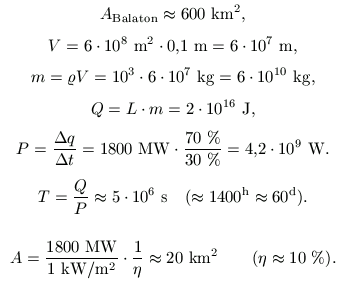 P. 3272. Tegyük fel, hogy az 1800 MW villamos teljesítményt szolgáltató, 30 % hatásfokú paksi atomerőmű maradékhőjét a befagyott Balaton 10 cm vastag jégrétegének felolvasztására használjuk. Mennyi idő alatt olvadna fel ez a jégmennyiség? Mekkora felületet kellene napelemekkel befedni egy olyan naperőmű építésénél, amelynek villamos csúcsteljesítménye megegyezne a paksi erőmű állandó villamos teljesítményével? (A Föld felszínére érkező napsugárzás energiája kb. 1 kW/m2.) (4 pont)