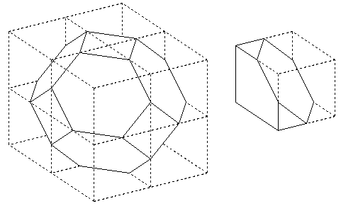 Vágjuk a nagy kockát 8 egybevágó kis kockára. Ekkor minden kis kockát az új test lapjai szabályos hatszögben metszenek. (Gy.3237-es feladat.) A kis kockákat ez a metszés két egybevágó részre vágja. Ezért a keresett arány 1:2.