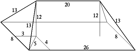 C. 564. Egy téglatest oldalélei 26, 20 és 8 egység hosszúak. A 26x8-as lapok fölé építsünk olyan egyenes sátortetőket, amelyek ,,ferde'' éleinek hossza 13, ,,vízszintes'' éle pedig 20 egység. Mekkora a téglatest azon részének térfogata, amelyet úgy kapunk, hogy eltávolítjuk a téglából a sátortetőknek a téglatesthez illeszkedő lapjukra vonatkozó tükörképeit?