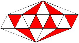 Megoldásvázlat. Az ikozaédernek mind a 12 csúcsa öt-öt háromszögnek csúcsa. Az öt háromszög közül legfeljebb kettőt színezhetünk pirosra. Ezért a pirosra színezett háromszögeknek összesen legfeljebb 12x2=24 csúcsa lehet, vagyis a piros háromszögek száma nem lehet nagyobb 8-nál. Nyolc lapot viszont pirosra színezhetünk az ábra szerint.
