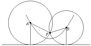 A vezéregyenes ugyanolyan távol van az A illetve B pontoktól, mint F. Rajzoljuk meg A és B körül azt a két kört, amely átmegy F-en. A vezéregyenes ennek a két körnek közös érintője.