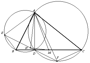 B. 3341. Az ABC háromszög A-ból induló magasságának talppontja D. Legyenek E és F egy, a D ponton átmenő egyenesnek olyan -- D-től különböző -- pontjai, amelyekre AE merőleges BE-re, AF merőleges CF-re. A BC és EF szakaszok felezőpontja M, illetve N. Bizonyítsuk be, hogy AN és MN merőlegesek. (5 pont)