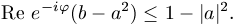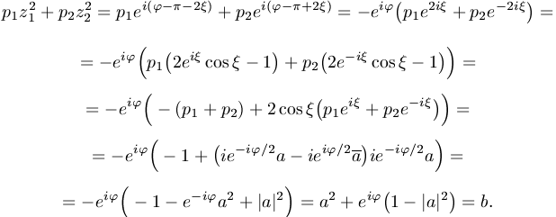 Most megmutatjuk, hogy ha |b-a2|=1-|a|2, akkor léteznek olyan p1, p2 nemnegatív valós számok és z1, z2 egységnyi abszolút értékű komplex számok, amelyekre p1+p2=1, p1z1+p2z2=a és p1z12+p2z22=b, vagyis a körlemez határpontjai megfelelőek.