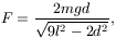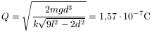 Megoldásvázlat. Egyensúlyban az egyes testekre ható erők eredője nulla, és a két test úgy helyezkedik el, hogy a közös súlypontjuk (az adott d távolságuk mellett) a legmélyebben, tehát a felfüggesztési pont alatt legyen. Eszerint a felfüggesztési ponton átmenő függőleges a d szakaszt 1:2 arányban osztja. Ebből a fonalak függőlegessel bezárt szöge kiszámítható, és így az erőegyensúlyt kifejező egyenletekben szereplő összes mennyiség meghatározható. Az elektromos taszítóerőre