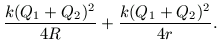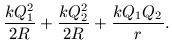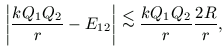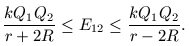 Megjegyzés. A fenti kifejezés akkor lenne pontos, ha mindkét gömb felszínén egyenletes maradna a töltéssűrűség, de nem marad az, mert az egyik gömb tere megváltoztatja a másik felületi töltéseloszlását és viszont. A fenti közelítés hibáját azonban könyen megbecsülhetjük. Ennek során feltesszük, hogy a Q1 és Q2 előjele azonos, de a becslés teljesen analóg akkor is, ha különbözők az előjelek. A kölcsönhatási energia pontos értékét E12-vel jelölve
