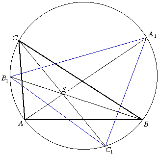 Legyen h az S pontnak a körülírt körre vonatkozó hatványa. Ekkor SA.SA1=SB.SB1=SC.SC1=|h|. A kerületi szögek tétele miatt a BCS és C1B1S háromszögek hasonlóak, ezért