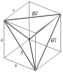 Megoldás. Mivel minden csúcsban különböző hosszúságú élek találkoznak, ezért a tetraéder szemközti élei egyenlő hosszúak. Így a tetraéder bennfoglaló paralelepipedonja téglatest, mert minden lapjára igaz, hogy annak átlói egyenlőek.