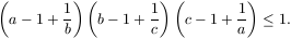 Megoldás. A 2000. évi Nemzetközi Matematikai Diákolimpia 2. feladatában azt kellett bizonyítani, hogy ha az a,b,c pozitív számok szorzata 1, akkor