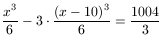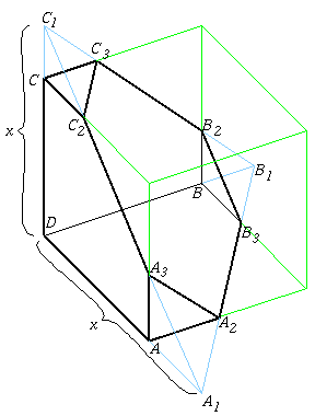 Megoldásvázlat. Tekintsük az ABC síkhoz közelebbi metsző síkot, és használjuk az ábra betűzéseit. A síknak a kockából 1004/3 egység térfogatú darabot kell levágnia. Mivel az ABCD tetraéder térfogata ennél kisebb, 1000/6 egység, ezért 10<x<15.