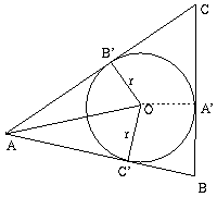 Jelölje a beírt kör oldalakkal való érintési pontjait rendre A', B', C'. Az AC'O és az AB'O háromszögekből kirakható az ábrán látható háromszög,