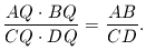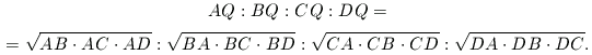 Az (1), (2) és (3) egyeneletekből kiszámíthatjuk az AQ, BQ, CQ és DQ távolságok arányát: