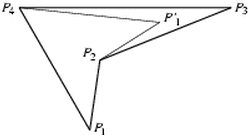 A feladatban leírt algoritmus szerint a P1 pontot kicserélhetjük a P1' pontra. Ezzel egy másik négyszöghöz jutunk, amely szintén negatív körüljárású, oldalai rendre 3, 2, 1, 2 egység hosszúak, és az 1 egységnyi oldal mellett van egy konkáv szöge. Ha mindig az egységnyi oldal hegyesszögű csúcsát tükrözzük a szemközti átlóra, minden lépésben ilyen tulajdonságú négyszögeket fogunk kapni, és így az eljárás nem ér véget.