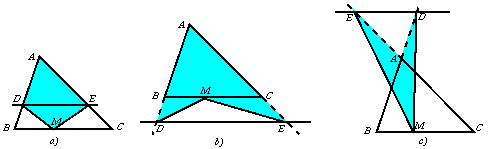 Megoldás. Attól függően, hogy az egyenes a háromszög oldalegyeneseinek melyik részét metszi, több eset is lehetséges.