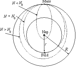 mellett a pálya nagytengelye éppen R+r, azaz az átszálló pálya a Mars-pálya mellett a Föld-pályát is csak érinti, és a két érintési pont a nagytengely két átellenes végpontja. Megjegyzendő, hogy ez a Földröl indítható, Mars-pályát érintő pályák közül a maximalis (!) energiájú, viszont ebben az esetben lehet a legjobban kihasználni a Föld sebességét a pályára állaskor. N0 értékét behelyettesítve némi átalakítások után