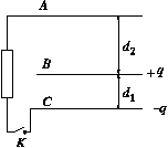 P. 3401. Three identical metal plates of area T are at distances d1 and d2 from each other. Metal plate A is uncharged, while metal plates B and C have respective charges +q and -q. Metal plates A and C are connected by switch K through a consumer of unknown resistance. What energy does the consumer give out to its surroundings? (5 points)