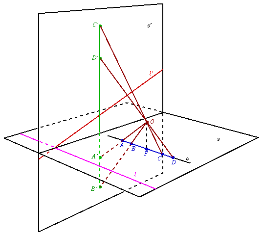 Az s és s' síkok pontjai között (beleértve az ideális, ``végtelen távoli'' pontokat is) kölcsönösen egyértelmű megfeleltetés az O pontból vetítés; az A, B, C, D pontok képe e vetítés szerint legyen rendre A', B', C' és D'. Könnyen ellenőrizhető, hogy \(\displaystyle \overrightarrow{A'B'}=\overrightarrow{C'D'}\).