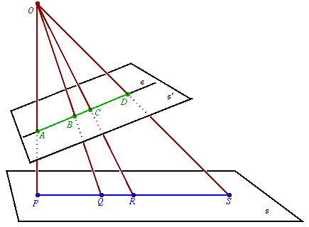 Vetítsük az origóból a P, Q, R, S pontokat egy olyan, az origóra nem illeszkedő s' síkra, amely merőleges a POS szög felezőjére. Az így kapott pontok legyenek A, B, C és D. Ezek a pontok egy egyenesen vannak, és \(\displaystyle \overrightarrow{AB}=\overrightarrow{CD}\). Még az is igaz, hogy az A, B, C, D pontok sorrendje ugyanaz, mint a P, Q, R, S pontok sorrendje.