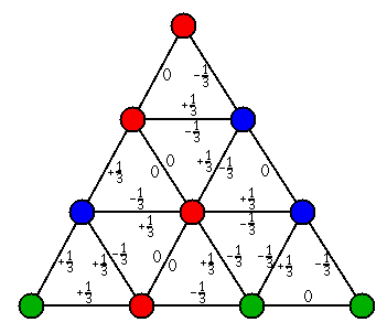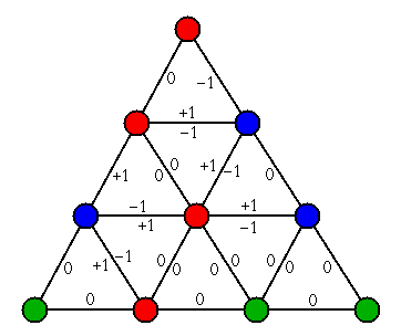 Könnyen ellenőrizhető, hogy azokban a háromszögekben, amelyekben vannak egyszínű csúcsok, a számok összege 0. A pozitív körüljárás szerinti piros-kék-zöld háromszögekben a számok összege 1, a negatív körüljárás szerint piros-kék-zöld háromszögekben -1. Az élekhez írt számok összege az egész táblán tehát éppen a pozitív és negatív körüljárás szerint piros-kék-zöld háromszögek számának különbsége, vagyis András és Benedek pontjainak különbsége.