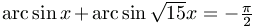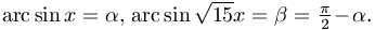 Ekkor sin\(\displaystyle alpha\)=x és \(\displaystyle \cos\alpha=\sin({{\pi}\over2}-\alpha)=\sin\beta=\sqrt{15}x\). A