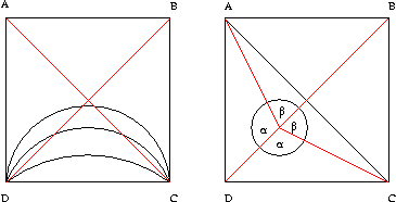 minden köríven pontosan két jó pont található, a jobboldali ábráról leolvasható, hogy ezek a pontok az átlókon helyezkednek el, hiszen \(\displaystyle alpha\)+\(\displaystyle beta\)=180o.