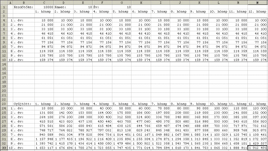 A4: "=HA(SOR(A4)-3<=$G$1;SOR(A4)-3;"")" A13-ig. B4: "=HA(SOR(B4)-3<=$G$1;". év:";"")" B13-ig. C4: "=HA(SOR(B4)-3<=$G$1;$C$1+C3*$E$1/100+C3;"")" N13-ig A24: "=HA(SOR(A24)-23<=$G$1;SOR(A24)-23;"")" A33-ig B24: "=HA(SOR(B24)-23<=$G$1;". év:";"")" B33-ig C24: "=HA(SOR(B24)-23<=$G$1;SZUM(D3:$N3)+SZUM($C4:C4);"")" N33-ig