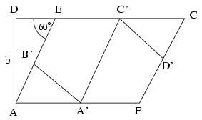 A rombuszt a középvonala mentén összehajtva az A'B'EC'D'F szabályos hatszöget kapjuk, C'EB'\(\displaystyle angle\)=120o, ezért az ADE derékszögű háromszögben AED\(\displaystyle angle\)=60o és \(\displaystyle {b\over x}=\sin60^{\circ}\)-ból