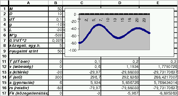 A 13 sorban tovább a kitérések található, melyeket az s2=s1+v1t+(a/2)t2 közelítéssel számolunk ki, vagyis például D13=C13+C12*$B$3+$B$7*C15