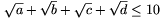 Megoldás. Megmutatjuk, hogy az \(\displaystyle S=\sqrt a+\sqrt b+\sqrt c+\sqrt d\) kifejezésnek az adott feltételek mellett maximális értéke 10, és S=10 pontosan akkor teljesül, ha a=1,b=4,c=9 és d=16. Ehhez először a következő állítást igazoljuk: Ha 0\(\displaystyle le\)x<y\(\displaystyle le\)z<v és x+v=y+z=K, akkor \(\displaystyle \sqrt{y}+\sqrt{z\)\sqrt{x}+\sqrt{v}">. Valóban, azonos átalakításokkal látszik, hogy az egyenlőtlenség sorra ekvivalens a \(\displaystyle K+2\sqrt{yz\)K+2\sqrt{xv}">, yz>xv, y(K-y)>x(K-x), (y-x)(K-y-x)>0 egyenlőtlenségekkel. Ez utóbbi azonban nyilvánvaló, hiszen y>x és K=y+z>y+x.