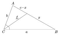 Az fc szögfelező a C oldalt x és c-x hosszúságú részekre osztja az ábra szerint, a C csúcsnál lévő szög \(\displaystyle gamma\). Mint ismeretes,