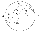 A k4 kör átmérője legyen d4=2x, a k2 kör átmérője d2=2y, ekkor k3 átmérője \(\displaystyle d_3=2x+\frac{2r}{5}\), és \(\displaystyle d_1=2y+\frac{2r}{5}\) a k1 átmérője.