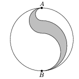 C. 651. Az ábrán látható egységnyi területű körben a szürke tartományt félkörívek határolják. Az AB átmérőnek 1/5 egységnyi része esik a satírozott tartomány belsejébe. Mekkora a satírozott tartomány kerülete és a területe?