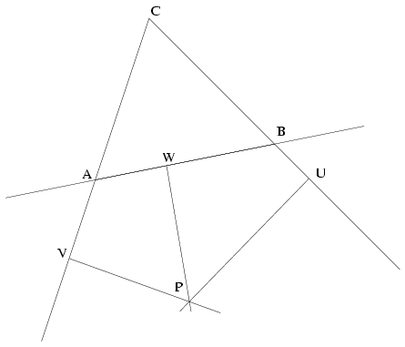 Tegyük fel most, hogy a három egyenes nem megy át egy ponton, és legyen Q az U és V pontokban a megfelelő oldalegyenesekre állított merőlegesek metszéspontja. Jelöljük a Q pontból az AB oldal egyenesére állított merőleges talppontját W0-val, ekkor W0\(\displaystyle ne\)W. Az első rész alapján AW02+BU2+CV2=AV2+CU2+BW02 vagyis (AW0-BW0)(AW0+BW0)=AV2+CU2-BU2-CV2. A már bizonyított állítás megfordításának igazolásához elég annyit megmutatni, hogy (AX-BX)(AX+BX)\(\displaystyle ne\)(AY-BY)(AY+BY) ha X,Y az AB egyenes két különböző pontja.