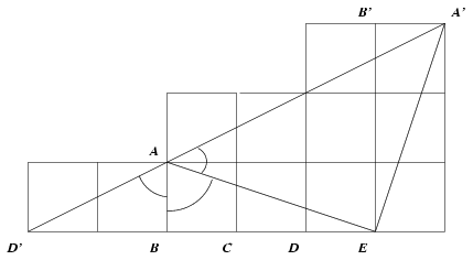 Az ábráról leolvasható, hogy BAD'\(\displaystyle angle\)=BAD\(\displaystyle angle\) és BAC\(\displaystyle angle\)=45o=EAA'\(\displaystyle angle\), tehát BAD\(\displaystyle angle\)+BAE\(\displaystyle angle\)+BAC\(\displaystyle angle\)=D'AB\(\displaystyle angle\)+BAE\(\displaystyle angle\)+EAA'=180o. (A feladat a tangensfüggvény addíciós képletének felhasználásával is megoldható.)