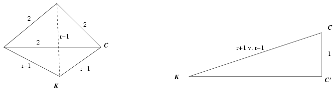 A három egységsugarú gömb középpontja egy 2 oldalhosszúságú, az S síkkal párhuzamos, attól 1 távolságra levő szabályos háromszöget határoz meg. A keresett r sugarú gömb K középpontja a háromszög mindhárom csúcsától r\(\displaystyle pm\)1 távolságra van aszerint, hogy az egységgömböket kívülről vagy belülről érinti. Jelölje a három középpont egyikét C, ennek az S síkra való merőleges vetülete legyen C'. A KC'C derékszögű háromszögben Pitagorasz tétele miatt \(\displaystyle KC'=\sqrt{KC^2-C'C^2}=\sqrt{(r\pm1)^2-1}=\sqrt{r^2\pm2r}\). Másrészt KC' hossza egyenlő a 2 egységnyi élű szabályos háromszög középpontjának a csúcsoktól való távolságával, \(\displaystyle {2\over{\sqrt{3}}}\)-mal. Így \(\displaystyle r^2\pm2r={4\over3}\), tehát \(\displaystyle r={{\sqrt{21}\pm3}\over3}\). Mindvégig feltételeztük, hogy a keresett sugarú gömb vagy mindhárom egységgömböt kívülről, vagy mindegyiket belülről érinti. ,,Vegyes'' konfiguráció nem létezik, mivel ha a K középpontú, r sugarú gömb a G1 középpontú gömböt kívülről, a G2 középpontút pedig belülről érintené, akkor KG1=r+1, KG2=r-1 szerint G1G2=2=(r+1)-(r-1)=KG1-KG2, azaz a G1G2K háromszög elfajuló, tehát K a G1G2 egyenesen lenne. Ez az egyenes azonban párhuzamos az S síkkal, ezért nincs vele közös pontja.