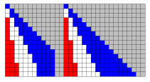 Ha a bal szélső cellát újabb impulzus éri, akkor újra elindítja az i-, j- és k-hullámot, s a mintázat újra kialakul (2. ábra). Ha pedig a cellasort szétszakítjuk (beszúrunk a táblázatba egy üres oszlopot), akkor a mintázat külön-külön mindkét részben kialakul. (3. ábra)