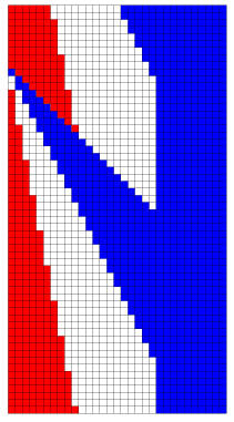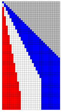 I. 27. A ,,Francia zászló'' probléma egy szabályozási feladat. Egymás mellett levő N darab, egyformán működő cellát olyan állapot-átmenet függvénnyel (cellába írandó képlettel) kell ellátni, aminek hatására az N cellában a francia zászló mintázata alakul ki: az első N/3 cella piros, a második N/3 cella fehér, a harmadik N/3 cella pedig kék színű lesz.