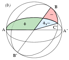 Összesen három lényegesen különböző esetet különböztethetünk meg aszerint, hogy C' az AA' és BB' egyenesek melyik oldalára esik; ezeket láthatjuk az ábrán. (A teljes megoldáshoz az olyan elfajuló eseteket is meg kell vizsgálni, amikor C' pontosan az AA' vagy a BB' egyenesre esik; ezeket két esethez is sorolhatjuk.) Az ábrán zöld színnel jelöltük azokat a területeket, amik a két vetített körcikk előjeles területében pozitív előjellel szerepelnek, piros színnel azokat, ahol negatív előjellel szerepelnek. A (b) esetben van egy olyan terület, ami mindkét vetületben szerepel, mégpedig ellentétes előjellel; ezt kék színnel jelöltük.