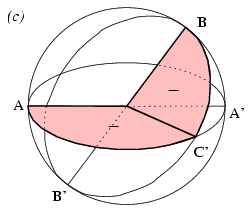 Vetítsük most a három körcikket az OAB síkra és jelöljük C'-vel a C pont vetületét, továbbá legyen A' és B' az A-val, illetve B-vel átellenes pont. A vetítés miatt C' az O középpontú egységkör belsejébe esik. Az AC és BC ívek vetülete egy AA', illetve egy BB' nagytengelyű ellipszis megfelelő íve. A két ellipszis összesen 4 pontban metszi egymást: mindkét, az A és A' pontokat összekötő félellipszis metszi mindkét, a B és B' pontokat összekötő félellipszist. Több metszéspont nem lehet, mert két különböző kúpszelet legfeljebb 4 pontban metszheti egymást.
