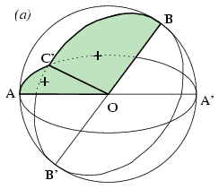 Megoldás. Legyen O a gömb középpontja, amelyen a háromszög elhelyezkedik; a csúcsokat a szokásos módon jelöljük A, B, C-vel. Feltételezhetjük, hogy a gömb sugara egységnyi. Tekintsük az OAB, OBC és OCA körcikkeket; ezek területe c/2, a/2, illetve b/2.