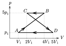 P. 3572. Bizonyos mennyiségű ideális gáz az ábrán látható körfolyamatot végzi. Mennyi a gáz által végzett munka egy ciklus során?