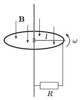P. 3587. Függőleges vezető tengelyhez elforgathatóan csatlakozik egy vízszintes fémrúd, amelynek másik vége egy l sugarú vezető körgyűrűre támaszkodik. A gyűrűt az ábra szerint egy R ellenálláson keresztül vezeték köti össze a tengellyel. (Minden más vezető ellenállása és a súrlódás elhanyagolható.)