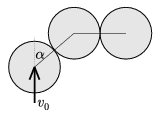 Megoldás. Úgy tekinthetjük, hogy először a bejövő golyó ütközik a bal oldali állóval, majd az meglöki a jobb oldalit. (Nagyon szorosan illeszkedő korongok ütközés elvben lejátszódhat másképp is: a második ütközés már azalatt ,,megkezdődhet'', amikor az első ütközés még be sem fejeződött. A gyakorlatban azonban ez nem valósul meg; gondoljunk az ingasorban felfüggesztett golyók ütközésére!)