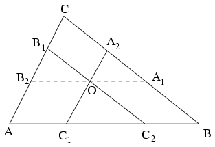 Legyen az ABC háromszög AC oldalával húzott párhuzamos C1A2, a BC oldallal húzott párhuzamos pedig C2B1, a kettő metszéspontja O, valamint legyen a harmadikként behúzott párhuzamos B2A1. Mivel C1A2B területe fele ABC területének, azért \(\displaystyle {C_1B\over AB}={1\over\sqrt2}\), ebből \(\displaystyle C_1B={1\over\sqrt2}AB\). Ugyanígy \(\displaystyle {AC_2\over AB}={1\over\sqrt2}\), és így \(\displaystyle AC_2={1\over\sqrt2}AB\).