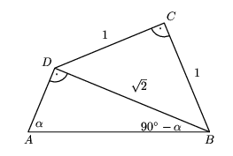 Megoldás.A BCD háromszög a feladat szerint egyenlő szárú derékszögű háromszög, amelynek C-nél van derékszöge. B-nél 45o -os szöge van. A négyszög A-nál és B-nél lévő (egyenlő) szögét \(\displaystyle \alpha\)-val jelölve az ABD háromszögben B-nél 90o -\(\displaystyle \alpha\) található. Eszerint 90o -\(\displaystyle \alpha\)+45o =\(\displaystyle \alpha\), vagyis \(\displaystyle \alpha\)=67,5o . Ha a BC=CD oldal hosszát egységnek tekintjük, akkor a BCD háromszögben \(\displaystyle BD=\sqrt2\), az ABD háromszögben pedig \(\displaystyle \rm tg\,\alpha={\sqrt2\over AD}\), azaz \(\displaystyle {AD={\sqrt2\over\rm tg\,67,5^{\circ}}\approx0,5858}\). Az 1 az AD-nek kb. 1,7-szerese.(Elemi úton pontos értéket kapunk: \(\displaystyle AD=2-\sqrt2\), és így az arány \(\displaystyle {1\over2-\sqrt2}\).)