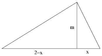 Megoldás. A háromszög területe nem csökken, ha akkorára nagyítjuk, hogy a legnagyobb oldala 2 legyen. Jelölje az ehhez tartozó magasságot m, ami az oldalt x és 2-x hosszúságú szakaszokra vágja. Pitagorasz tétele szerint a másik két oldal \(\displaystyle \sqrt{m^2+x^2}\le2\) és \(\displaystyle \sqrt{m^2+(2-x)^2}\le2\).