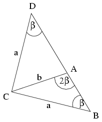Megoldás. Tekintsük a feladatot megoldottnak. Legyenek a háromszög csúcsai a szokásos jelölésekkel A,B,C; D pedig legyen az AB egyenesnek az a B-től különböző pontja, melyre CD=CB. Ekkor a CDB háromszög egyenlő szárú, vagyis CDB\(\displaystyle \angle\)=CBD\(\displaystyle \angle\)=\(\displaystyle \beta\). A CDA háromszög A-nál lévő külső szöge CAB\(\displaystyle \angle\)=2\(\displaystyle \beta\), ezért DCA\(\displaystyle \angle\)= CAB\(\displaystyle \angle\)- CDA\(\displaystyle \angle\)=\(\displaystyle \beta\), vagyis a CDA háromszög is egyenlő szárú, DA=AC=b.