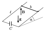 P. 3667. Két párhuzamos, egymástól b távolságra futó sínt egy C kapacitású kondenzátorral kötöttünk össze. A kondenzátortól \(\displaystyle \ell\) távolságra egy m tömegű fémhuzalt helyeztünk a sínpárra, a sínekre merőlegesen. Az így kapott keretet homogén mágneses térbe helyeztük úgy, hogy a keret síkja a vízszintessel \(\displaystyle \alpha\) szöget zár be. A B mágneses indukcióvektor iránya függőleges. A súrlódás és az ohmos ellenállás elhanyagolható.