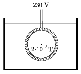 P. 3665. Egy vékony fűtőspirálból 3 cm sugarú, kör alakú merülőforralót készítettünk, amelyet vízbe mártottunk. Mennyi idő alatt melegít fel 0,5 liter vizet 10 oC-ról 60 oC-ra a 230 V-os hálózatra kapcsolt merülőforraló, ha a kör középpontjában maximálisan 2.10-5 T mágneses indukciót kelt, és a melegítés hatásfoka 80%?