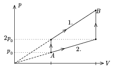 P. 3666. Héliumgázt kétféleképpen juttathatunk el az A állapotból a B állapotba (lásd az ábrát). Melyik folyamat esetén nagyobb a végzett munka és a felvett hő aránya?