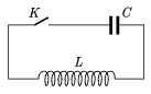 P. 3668. Az ábrán látható ideális rezgőkörben a kondenzátor kapacitása 25 \(\displaystyle \mu\)F, feszültsége 10 V, a tekercs induktivitása 0,04 H. Mekkora lesz a rezgőkörben keringő áram legnagyobb értéke a K kapcsoló zárása után?